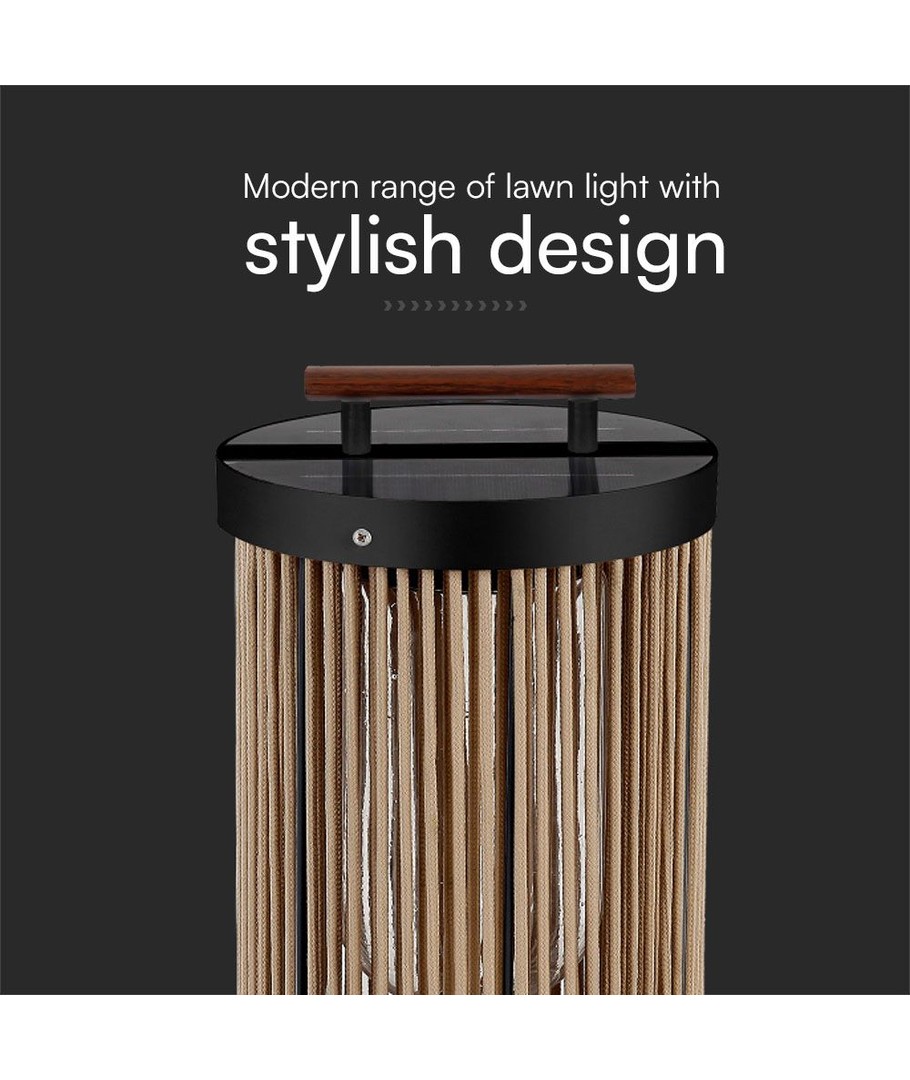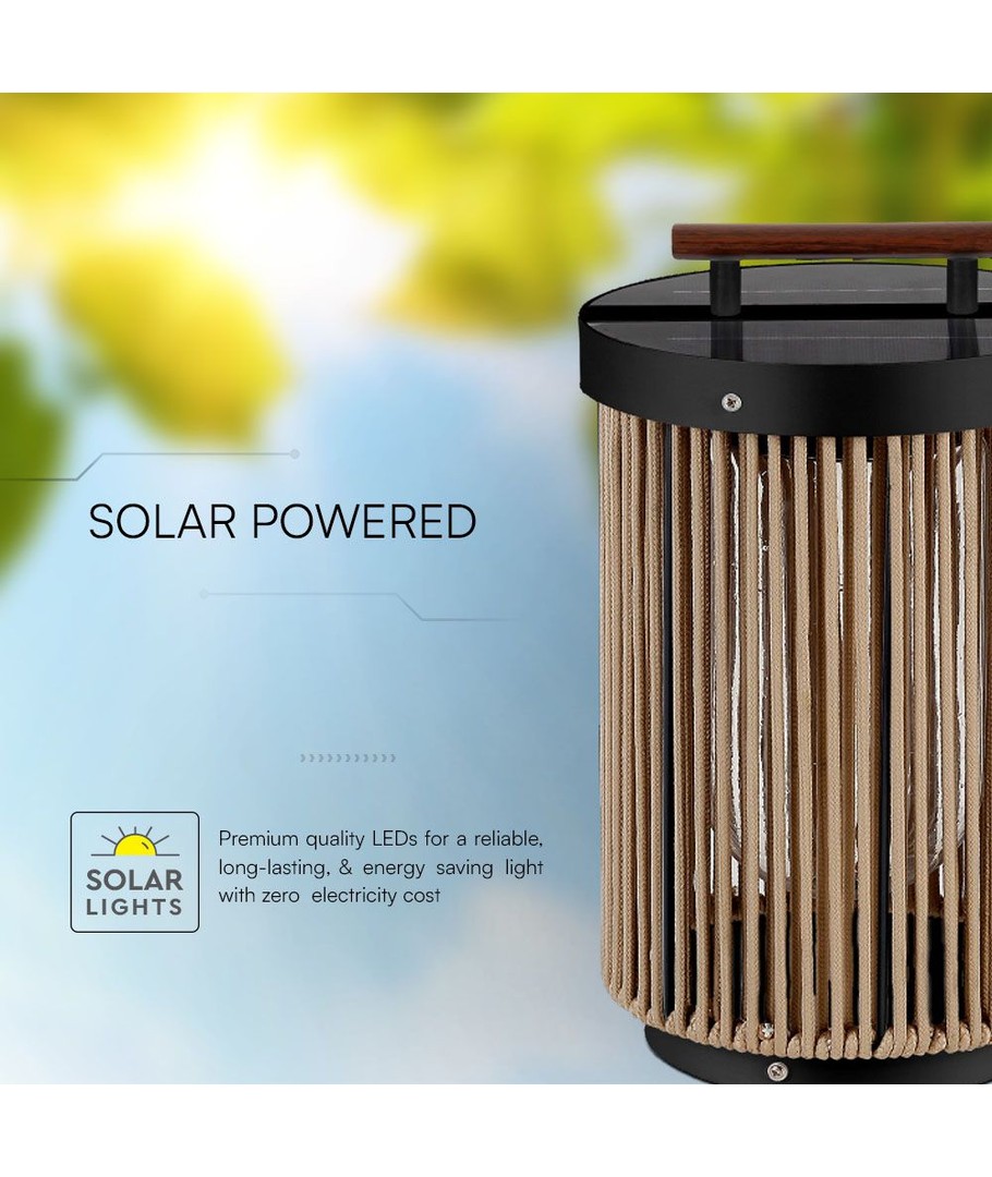 Unikt Design:Den sorte finish kombineret med hampegreb og træhåndtag gør lygten til en stilfuld tilføjelse til enhver udendørs indretning. Det naturlige look fungerer godt i både moderne og traditionelle haver.