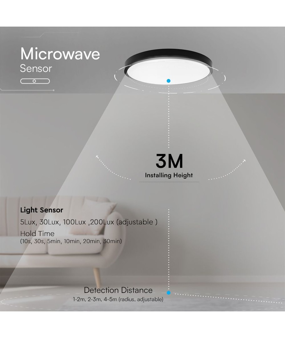 | Yderligere bemærkninger | Light-on duration: 10s, 30s, 5min, 10min, 20min, 30min. Sensor distance: 1-2m,2-3m,4-5m(radius,adjustable). Ambient light level: 5lux,30lux,100lux,200lux(adjustable). |