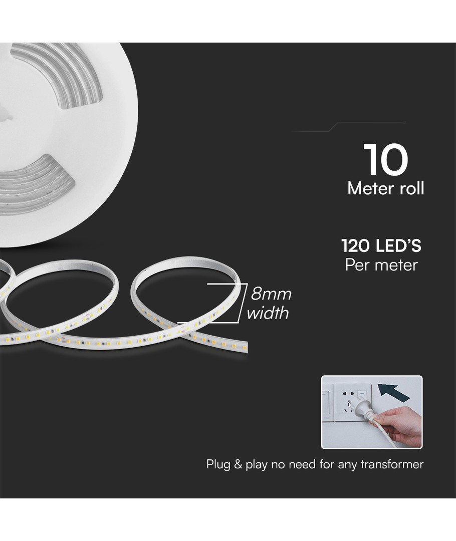 Oplev den fantastiske lysstyrke med en høj spredning på 120 grader, som sikrer en jævn fordeling af lyset i hele rummet. Denne LED-stribe er perfekt til dem, der ønsker optimal belysning både indendørs og udendørs.