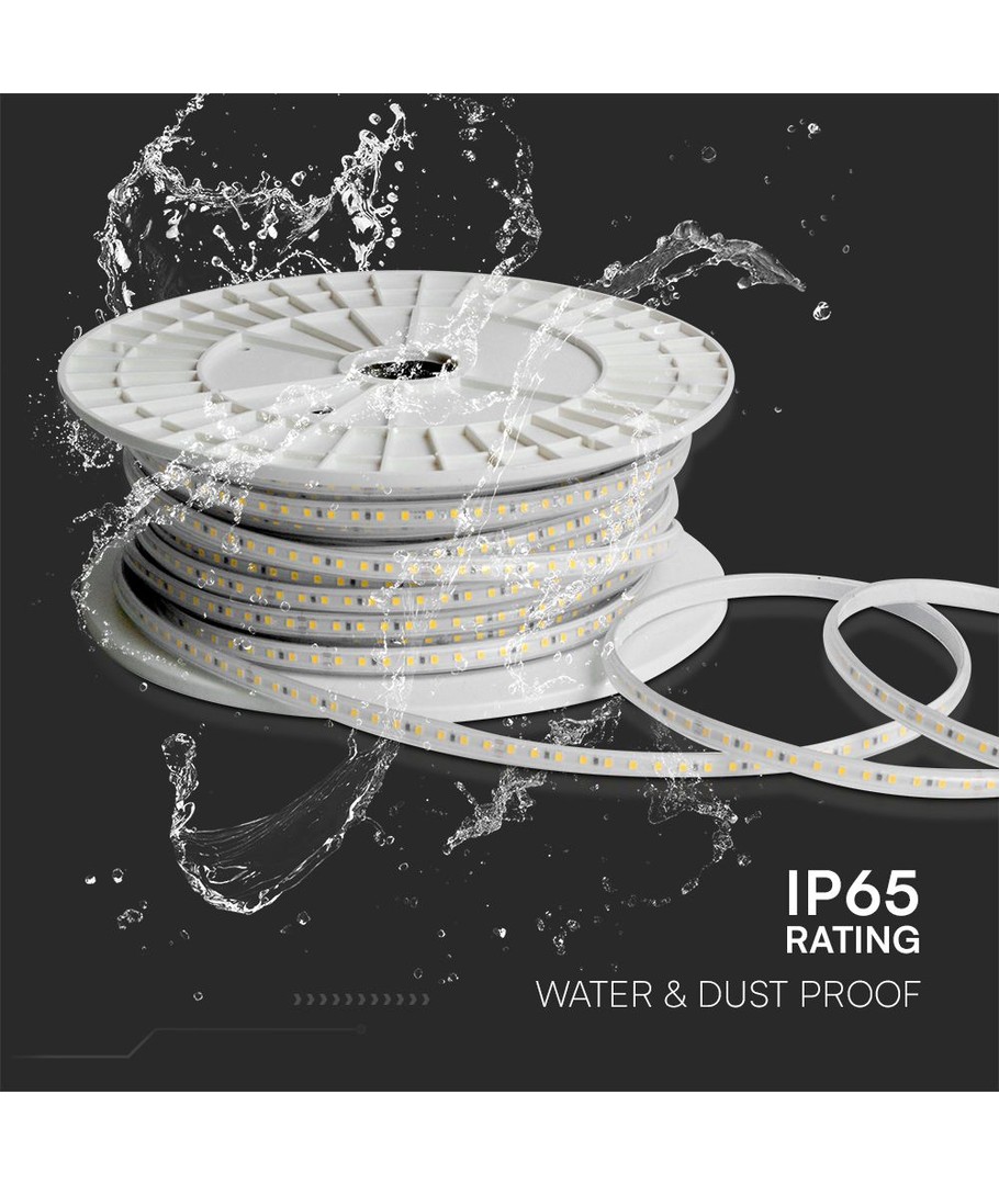 Dimensionerne er beskedne på blot 8 mm, hvilket gør den nem at installere, selv på trænge steder. Med en IP65-klassificering er denne LED strip designet til både indendørs og udendørs brug, da den er modstandsdygtig over for vandstænk og regn.