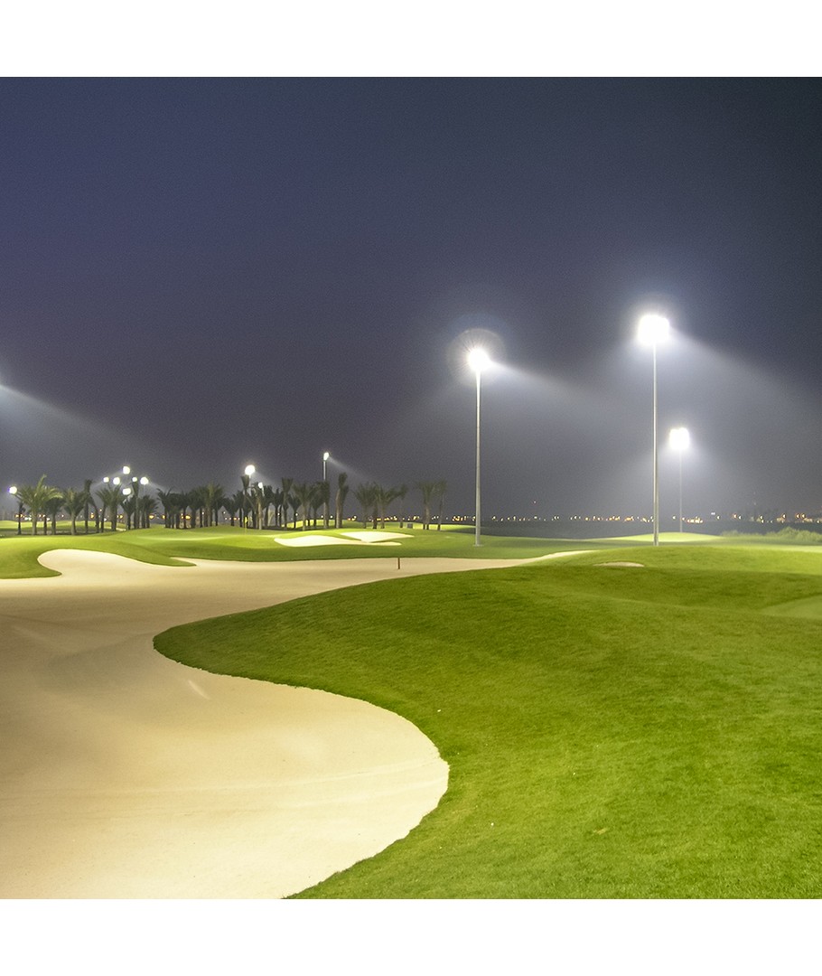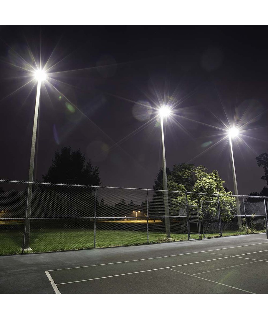 Projektøren har en robust, sort hus og sort glas, der passer diskret ind i enhver udendørs omgivelser. Med dimensionerne 840 x 74 x 676 mm, kombineret med den praktiske 1m ledning, er installationen både simpel og fleksibel.