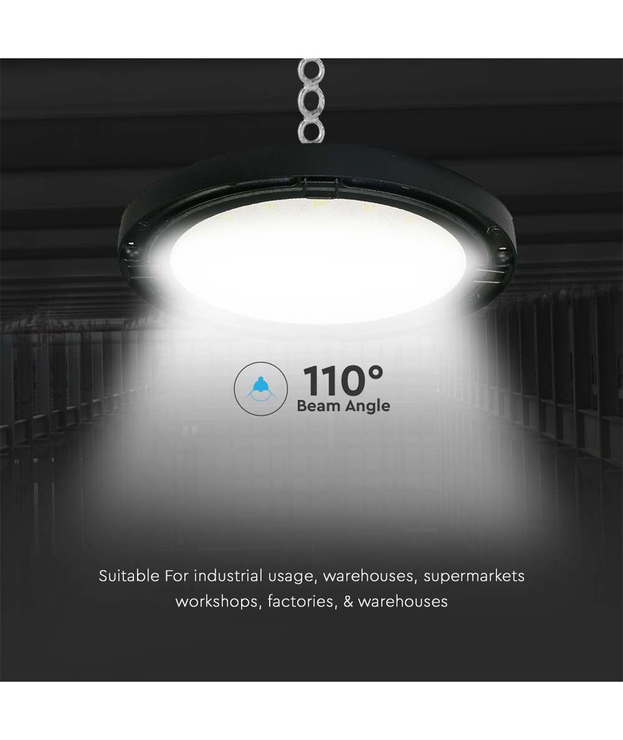 Oplev kraftfuld belysning med VT-92100 100W LED HIGHBAY, der leverer en lysstyrke på 12000 lumens. Med en lysfordeling på hele 110 grader sikrer denne lampe en jævn og bred belysning.