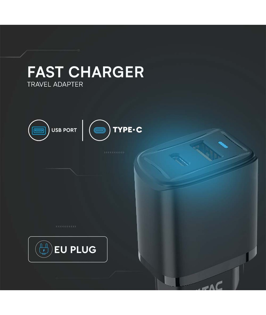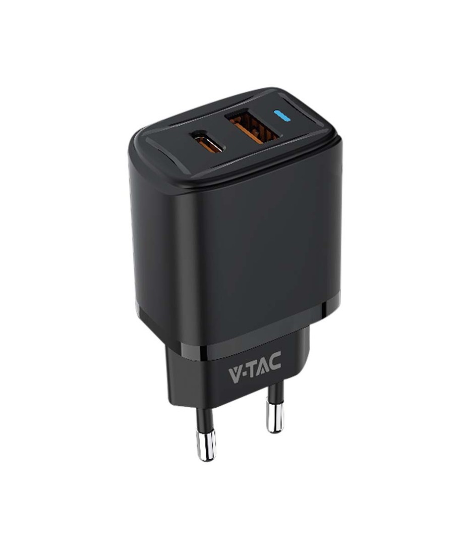20W USB rejseadapter med PD og QC - Sort, hurtiglader, 1x USB-A og 1x USB-C PD V-TAC Udvid