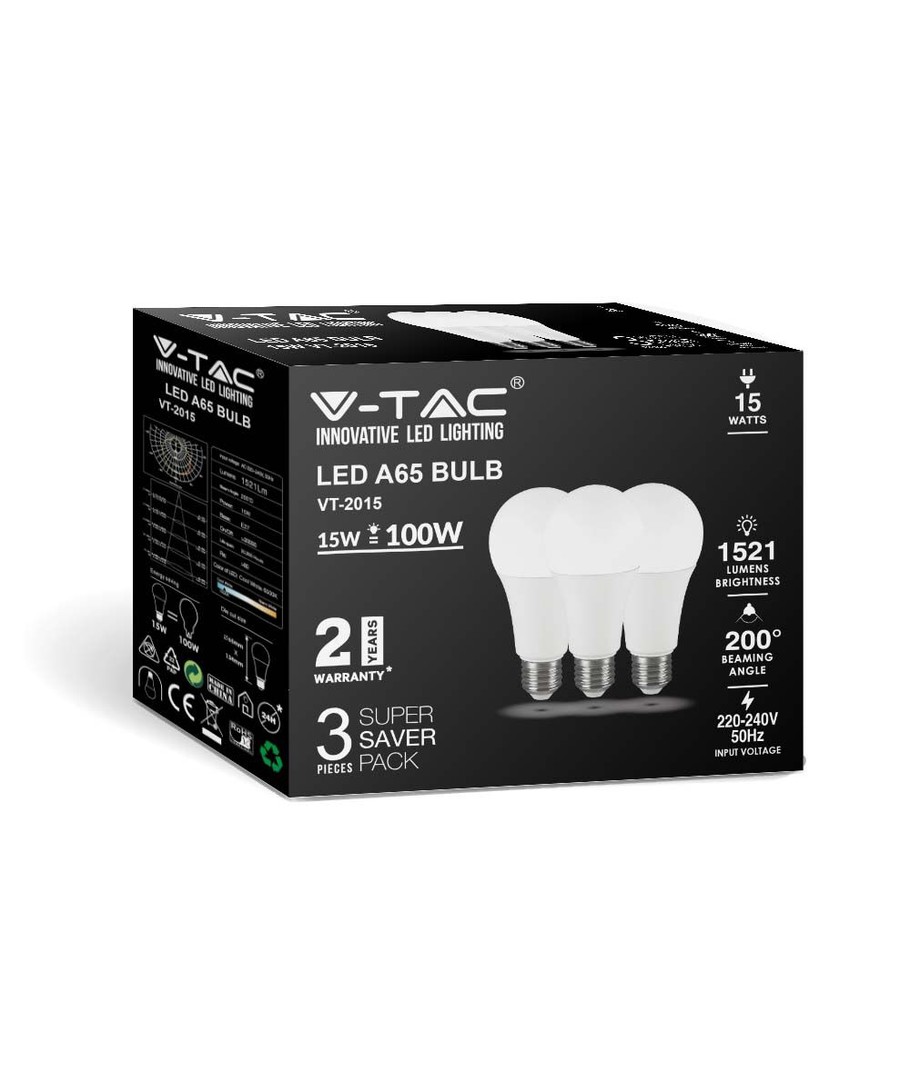 A65 VT-2015 LED 15W E27 - plastpære, 6500K, 200°, 3 stk./pakke V-TAC Udvid
