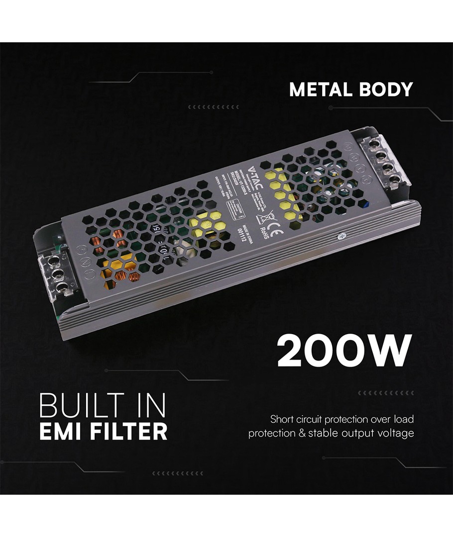 200W / 12V DC strømforsyning til LED strips - tilbyder pålidelig og effektiv strømkapacitet i et slankt design.