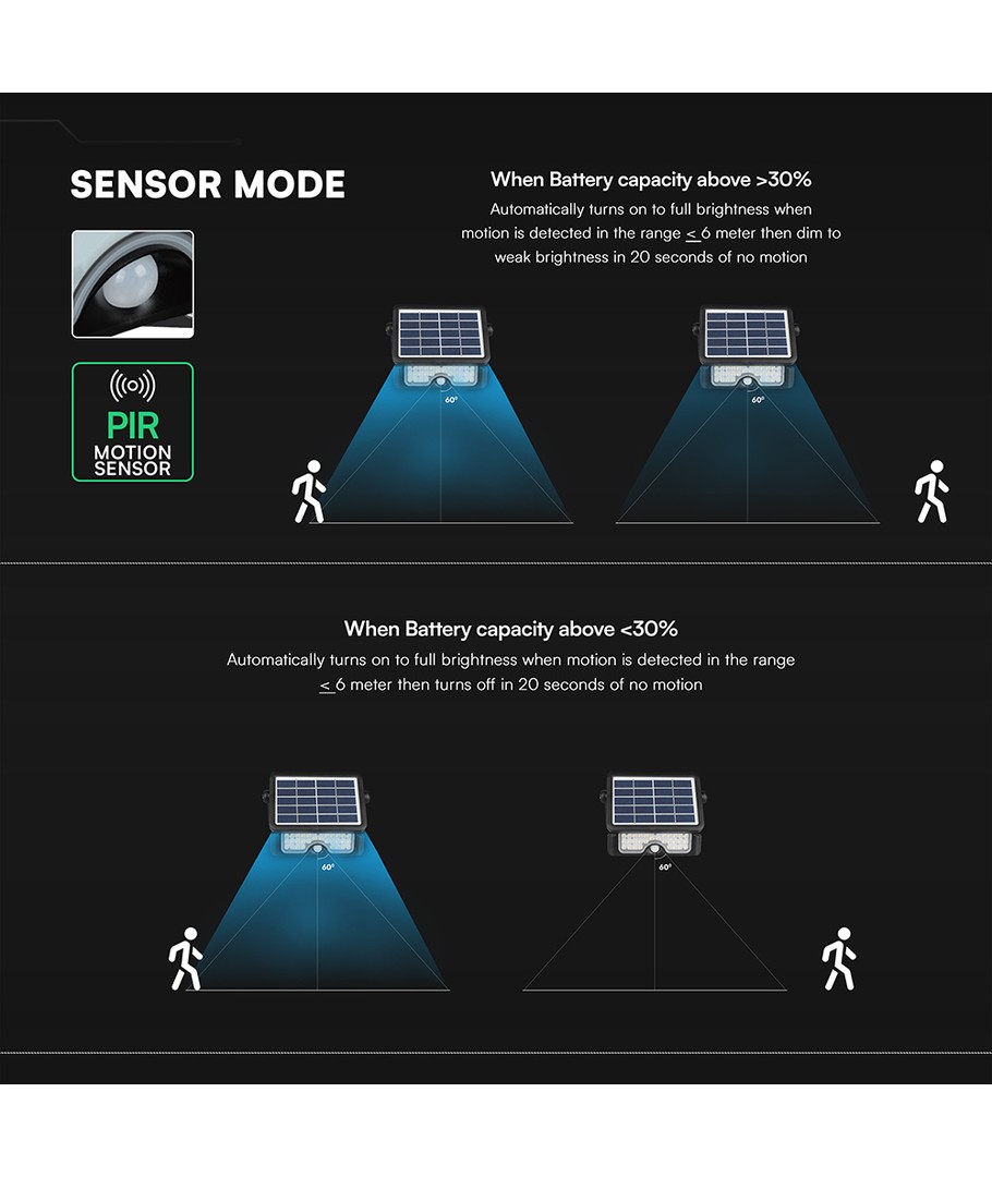 | Yderligere bemærkninger | Battery: 3.7V Lithium Battery, 3600mAh. Charging time: 6-8 Hours Sunlight Charging. Working time: 60 Hours (Max). Sensor type: PIR. |