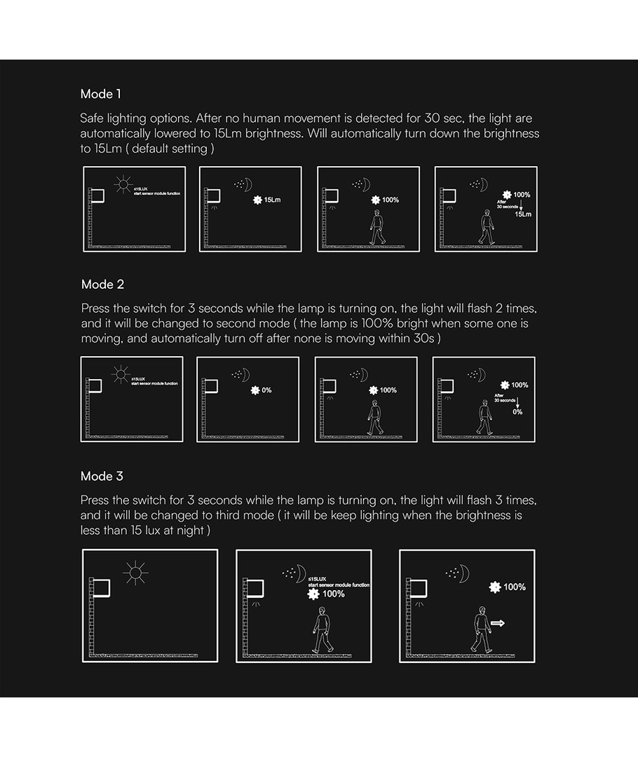 | Yderligere bemærkninger | Battery: DC:3.7V Li-ion 2600mAh Battery. Charging time: 8 Hours. Working time: 30 Hours (Max). Sensor type: PIR. Sensor angle: 120°. Ambient light level: 5-15Lux. |