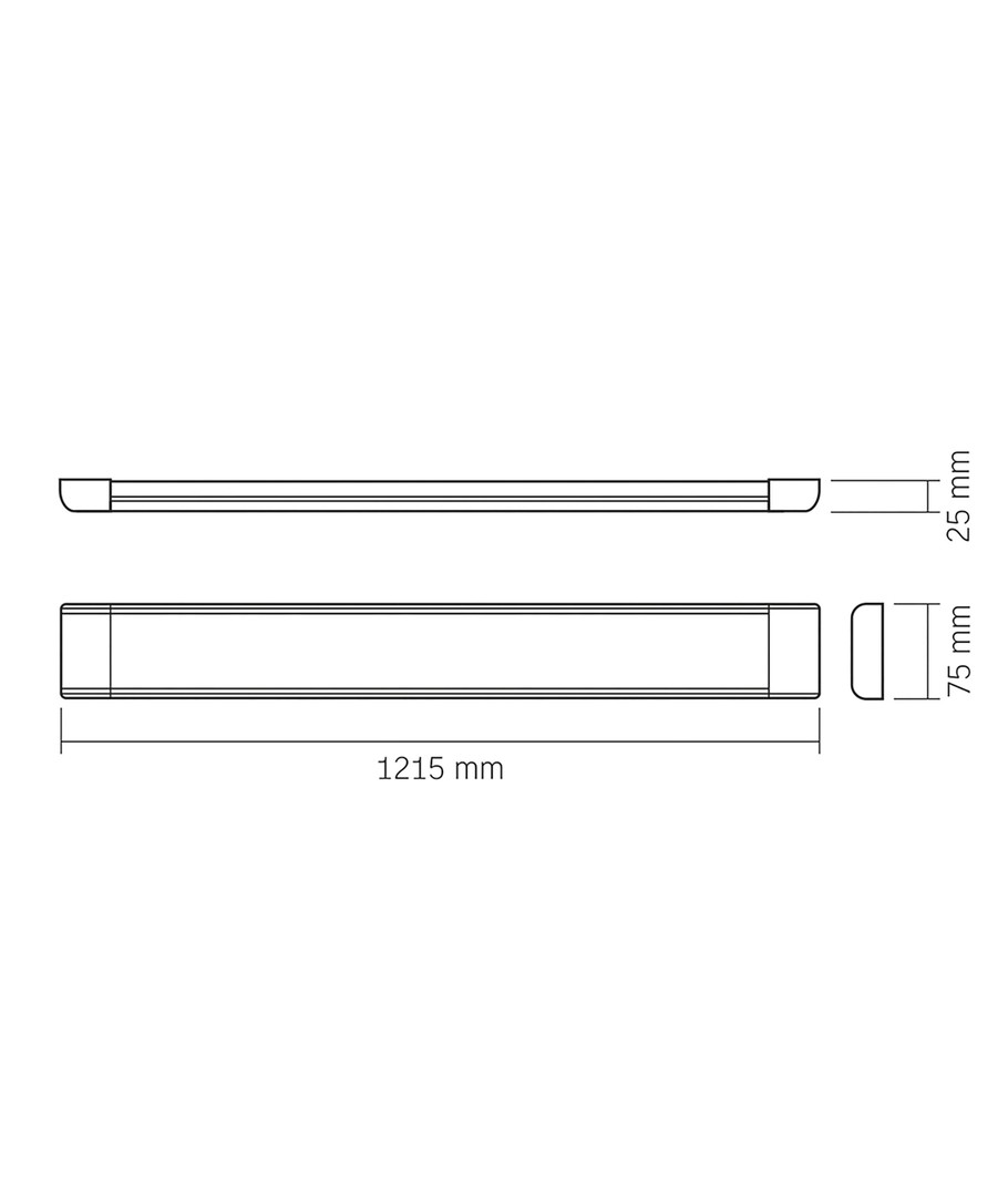 Armaturet har dimensionerne på 75 x 1215 x 25 mm og en IP20-klassificering, hvilket betyder, at det ikke er modstandsdygtigt over for vand. Det integrerede lyskilde-design sikrer en problemfri installation og vedligeholdelse.